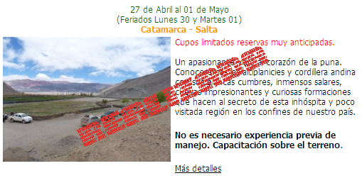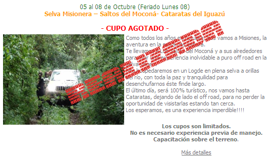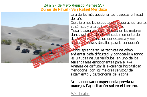El programa de actividades, los recorridos y los servicios pueden sufrir alteraciones por fuerza mayor, intentaremos anunciar con la mayor antelación posible cualquier modificación al programa. Pueden traer sus GPS o cualquier otro accesorio que deseen probar, será un placer asistirlos en su correcta utilización. |