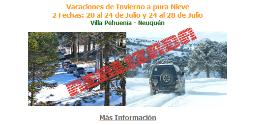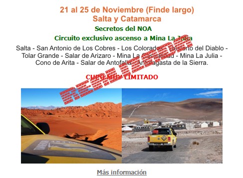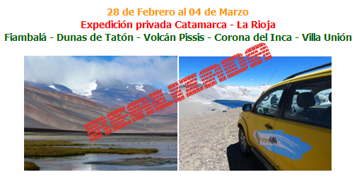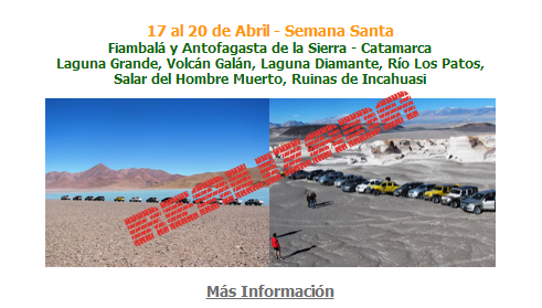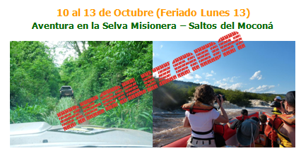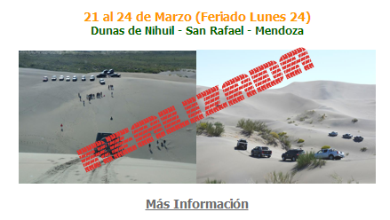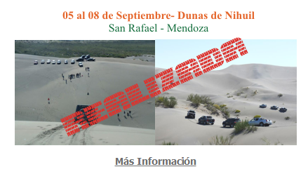 El programa de actividades, los recorridos y los servicios pueden sufrir alteraciones por fuerza mayor, intentaremos anunciar con la mayor antelación posible cualquier modificación al programa. Pueden traer sus GPS o cualquier otro accesorio que deseen probar, será un placer asistirlos en su correcta utilización. |
